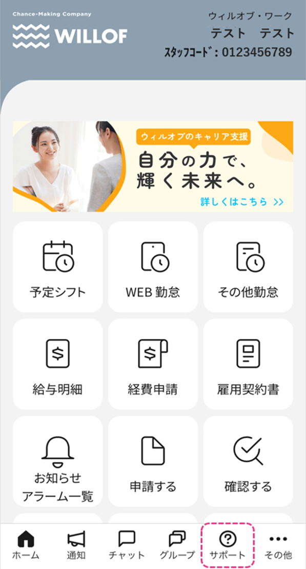 アプリ下部のナビゲーション「サポート」をタッブしてください。